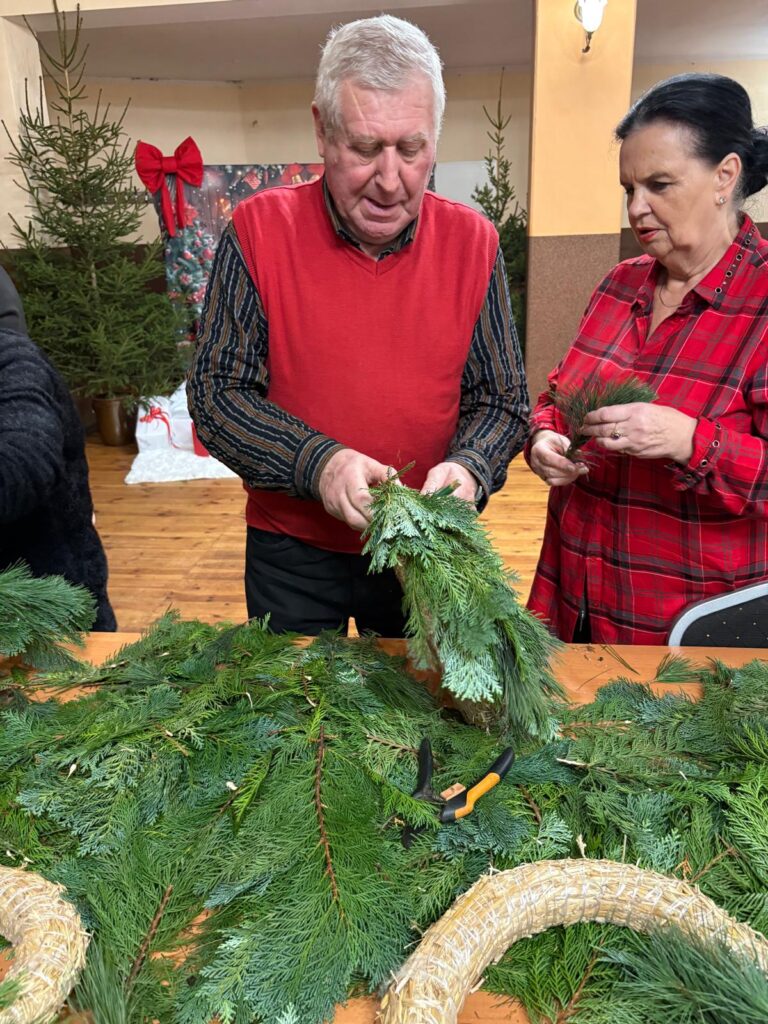 W warsztatach uczestniczyli seniorzy ze Stacjonarnego Klubu Seniora w Kuźnicy Czarnkowskiej, którzy z wielkim zaangażowaniem tworzyli bożonarodzeniowe kompozycje, dzieląc się swoim doświadczeniem i kreatywnością.
